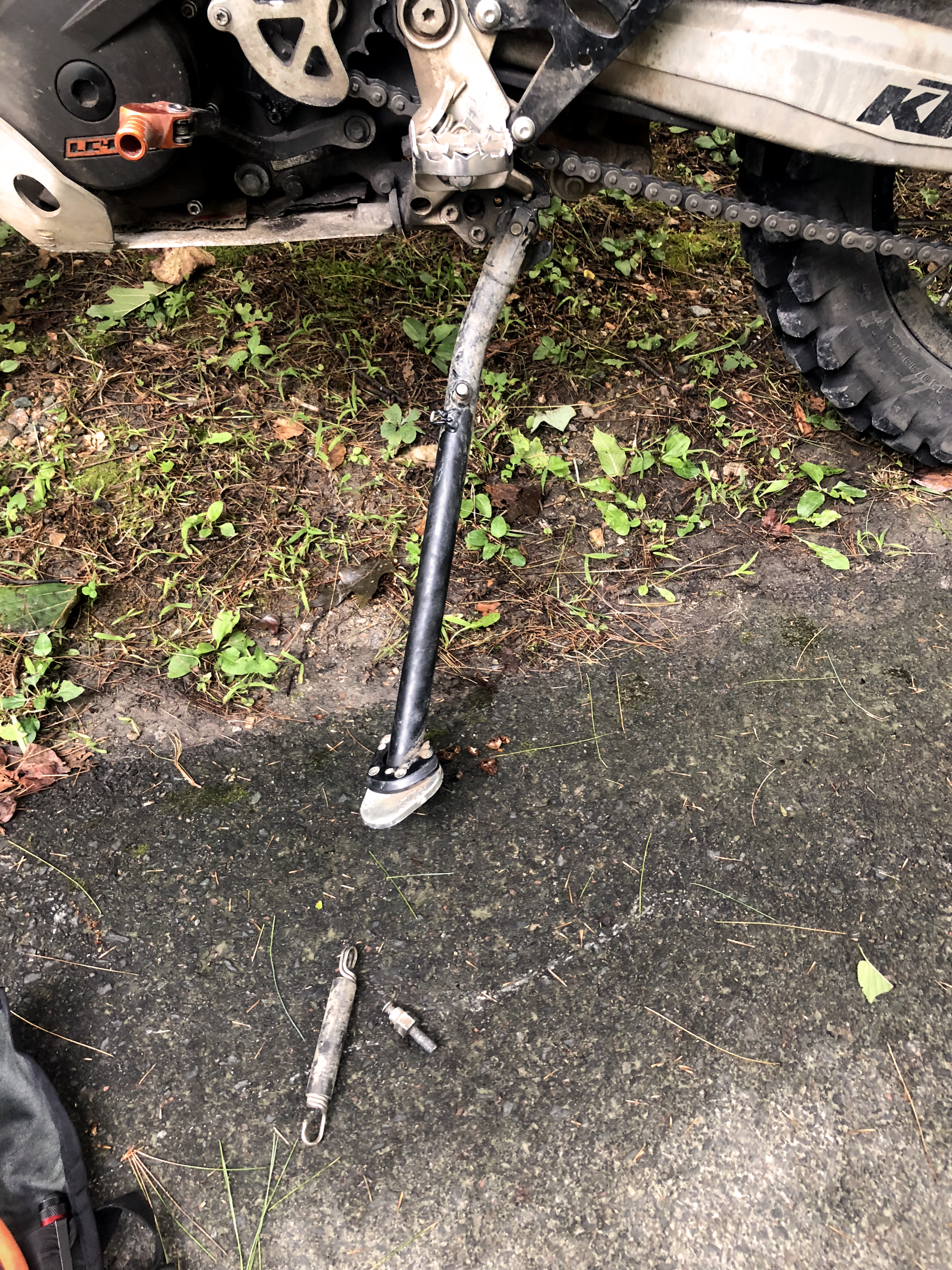 I was up early to catch the sunrise, but as soon as I got on the road, things went downhill. The side stand spring bolt broke. It's completely stripped. This is gonna be a real pain. I was leaning the bike against trees and gas pumps all day long.