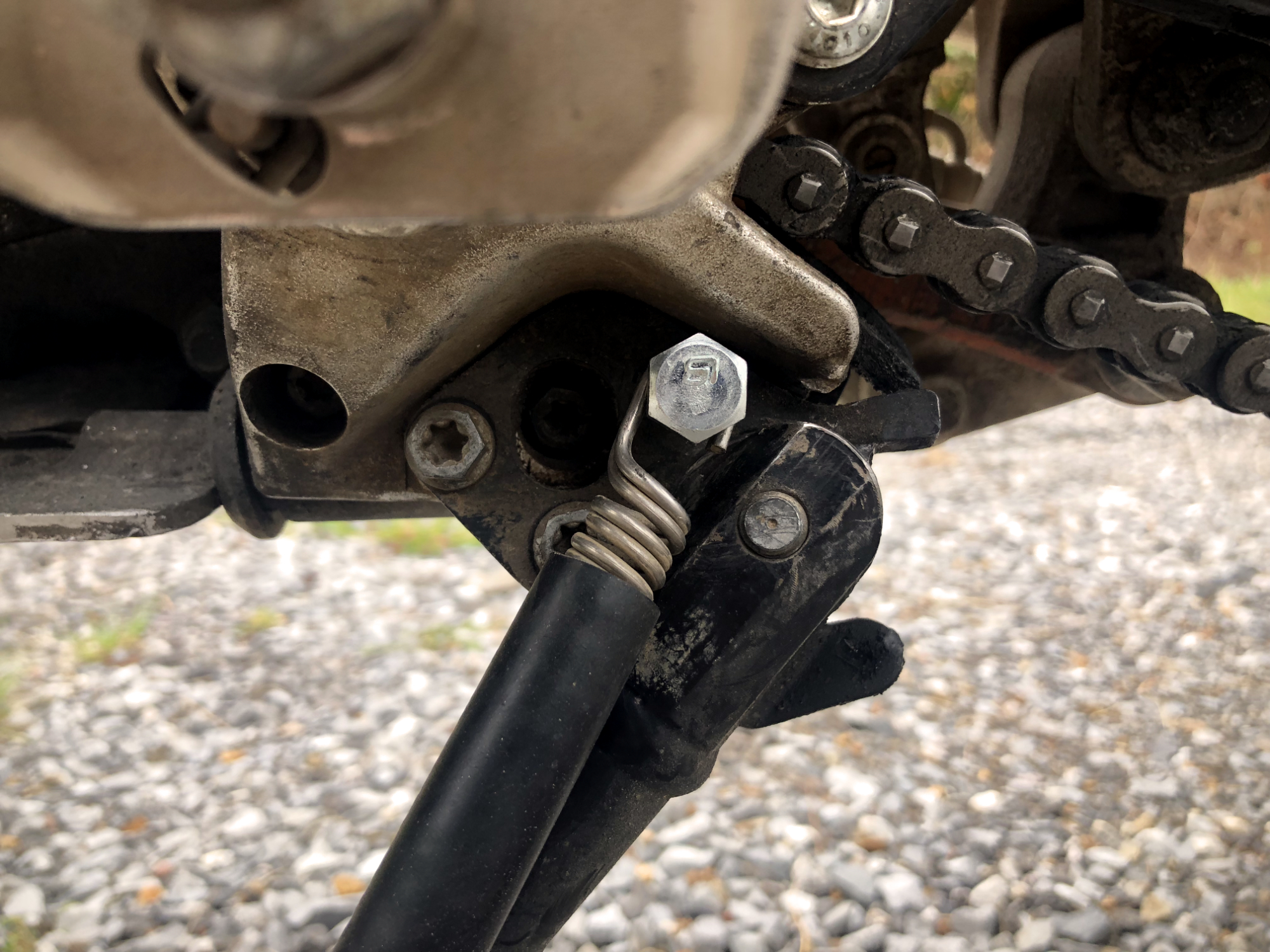 I fixed – at least temporarily – my side stand spring issue. I set a regular old bolt in there with some loctite and it's worked all day. I'm hoping it will stick.