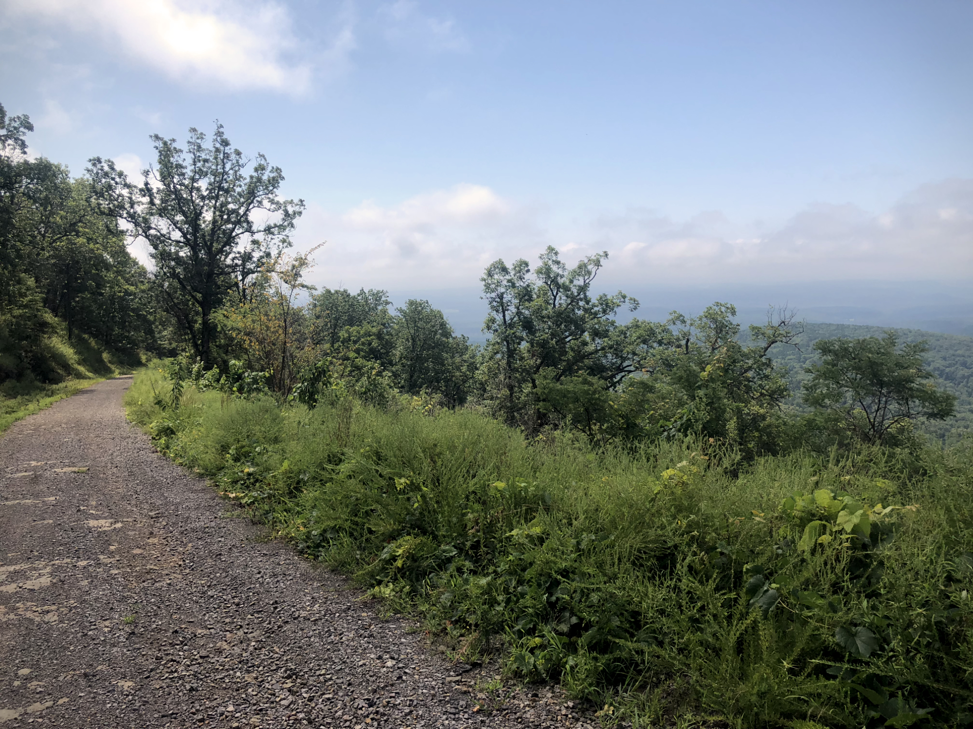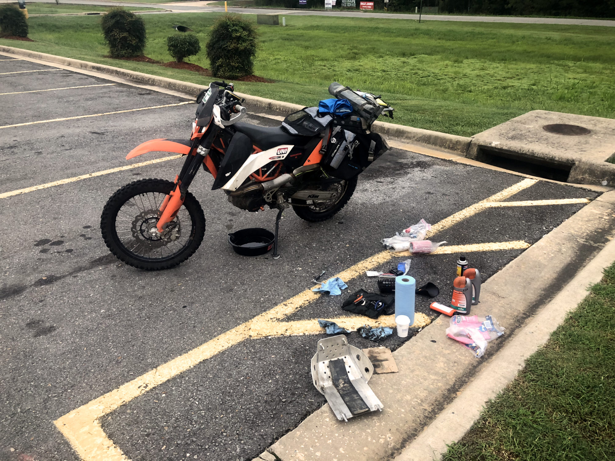 I changed the oil this morning at a Walmart parking lot. All went smoothly. It had rained overnight, and the woman at the motel desk said I should prepare for mud. I hoped she was wrong, and she was. It was misty as I got out into the hills, and the riding was much better than yesterday on wide, nicely graded gravel, with fun switchbacks and climbs. The sun came out after an hour or so and burned off the mist.