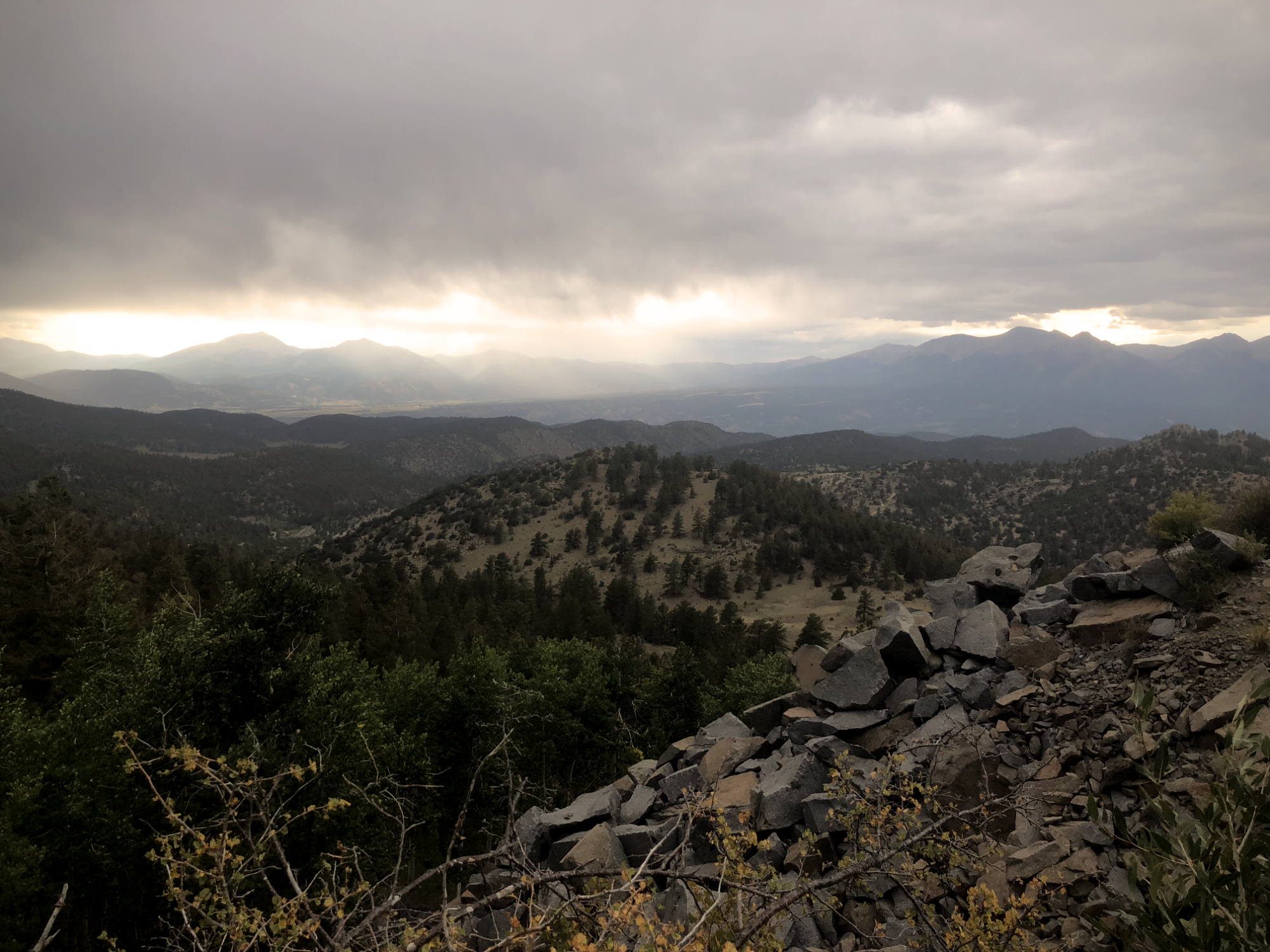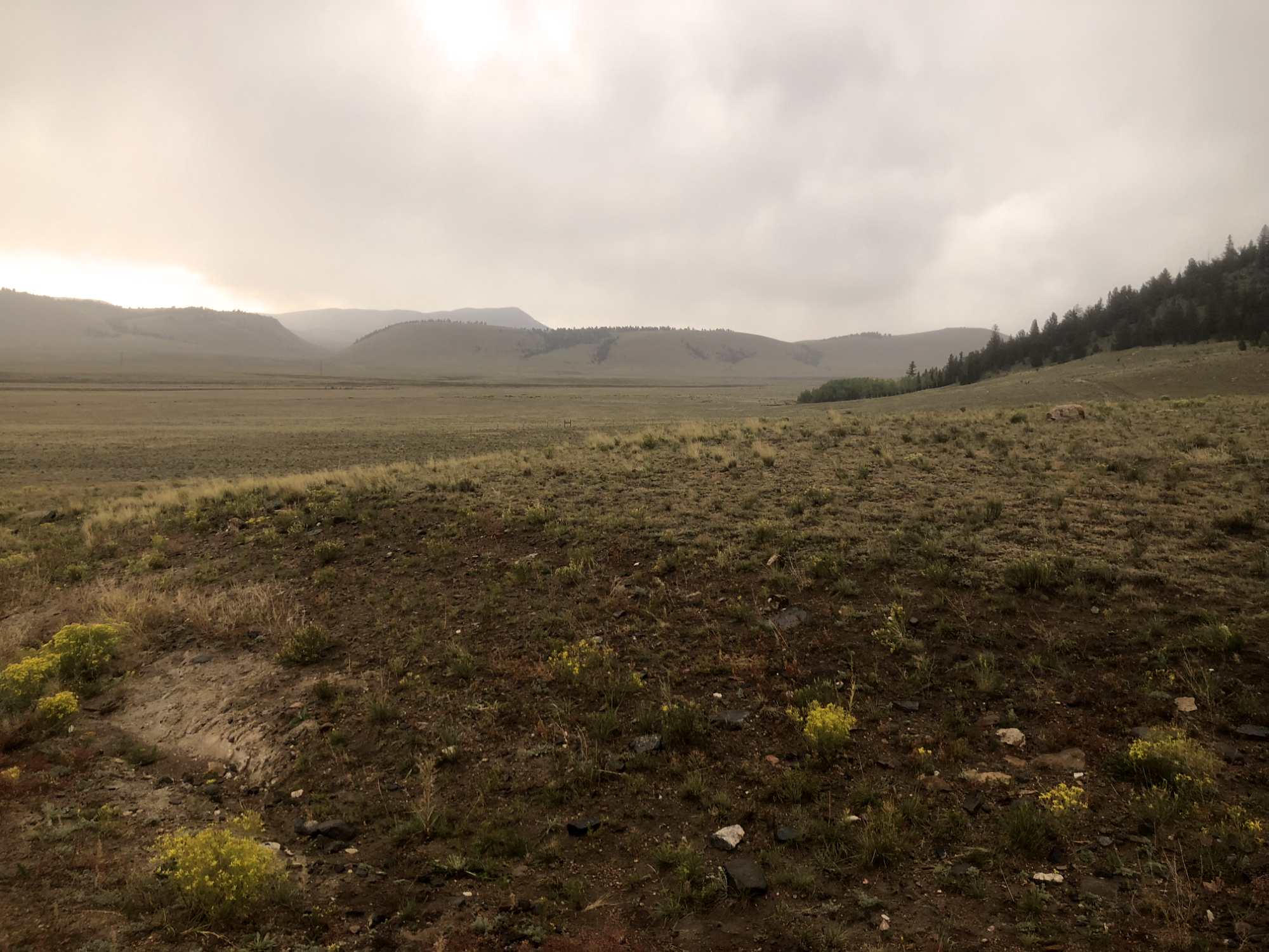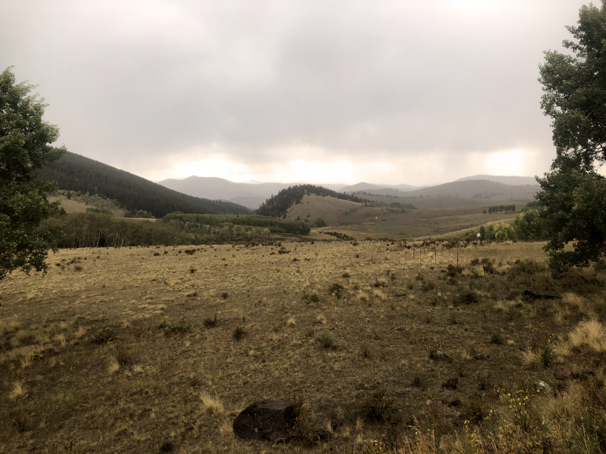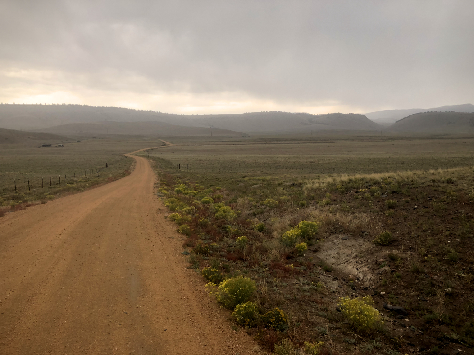 I was heading southwest to rejoin the TAT by 2pm. I took US-50, a very nice road that runs along the Arkansas River to Cotopaxi and then headed north into the Pike-San Isabel National Forest. The skies were dark, and I knew I was heading into rain, but it didn't look bad, and I needed to put in some dirt miles before the sun set. The pavement turned to packed dirt, and the elevation increased. It started raining and became much cooler, so I took it slow, unsure how the Colorado terrain would be when wet. There were some slippery spots, but it felt fairly consistent. I passed through aspen groves, plenty of ranches, and huge mountains meadows. The road followed a canyon down and into Salida where I stopped for the night.