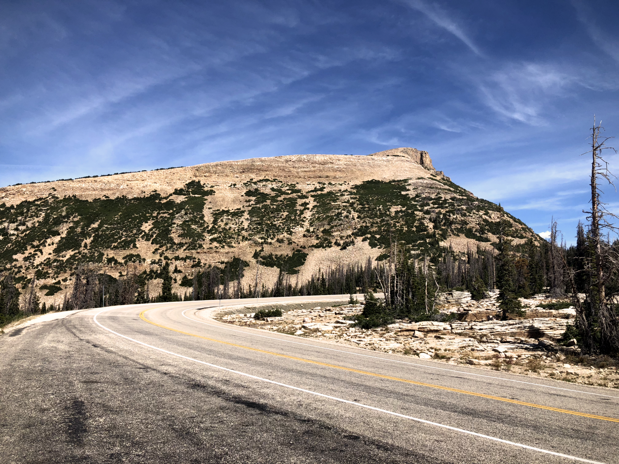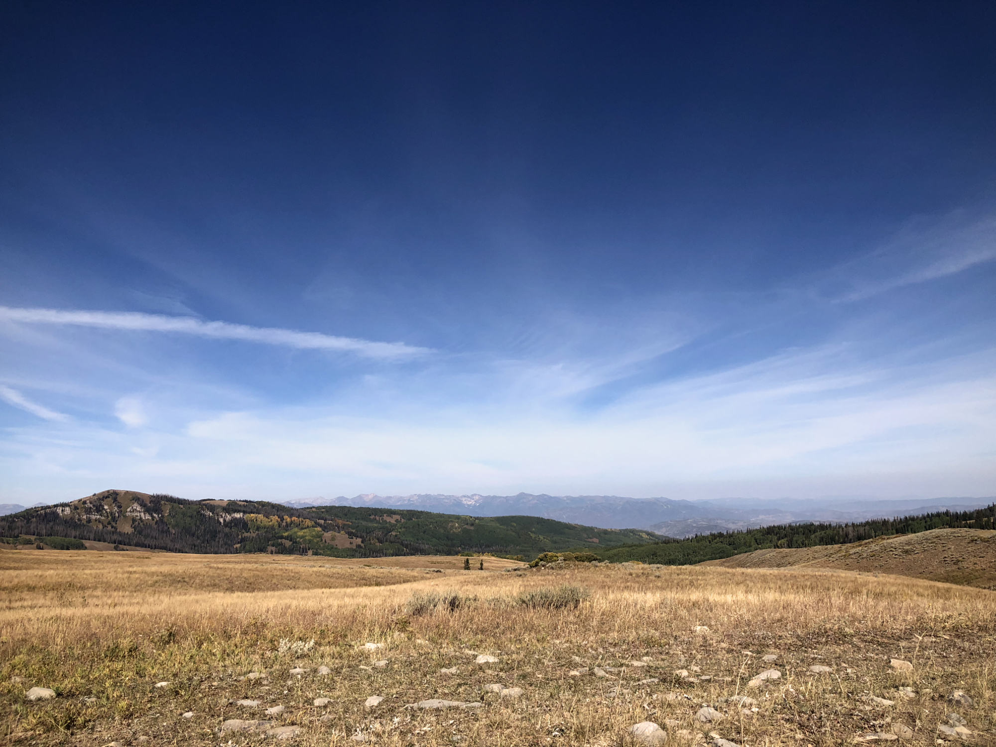 I got back on some wider dirt roads, then on to Mirror Lake Highway, and over Bald Mountain Pass. Gorgeous views just about everywhere. The track then cuts into Whitney Basin on a rocky road. After some alpine forest and more aspen, everything opened up, and I rode an awesome ridge with incredible views.