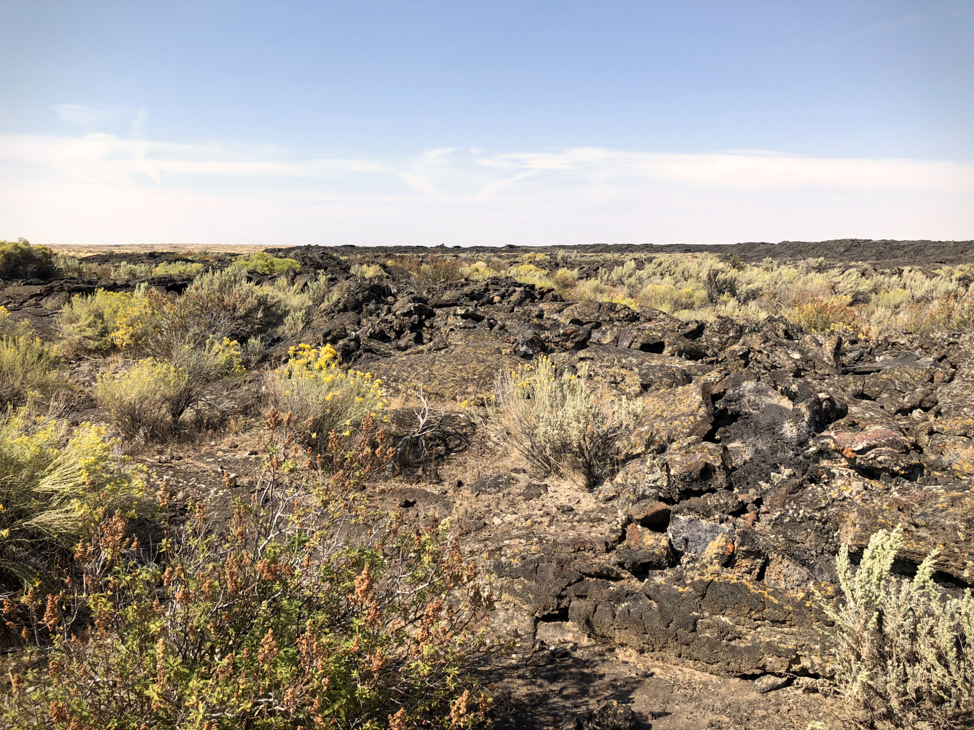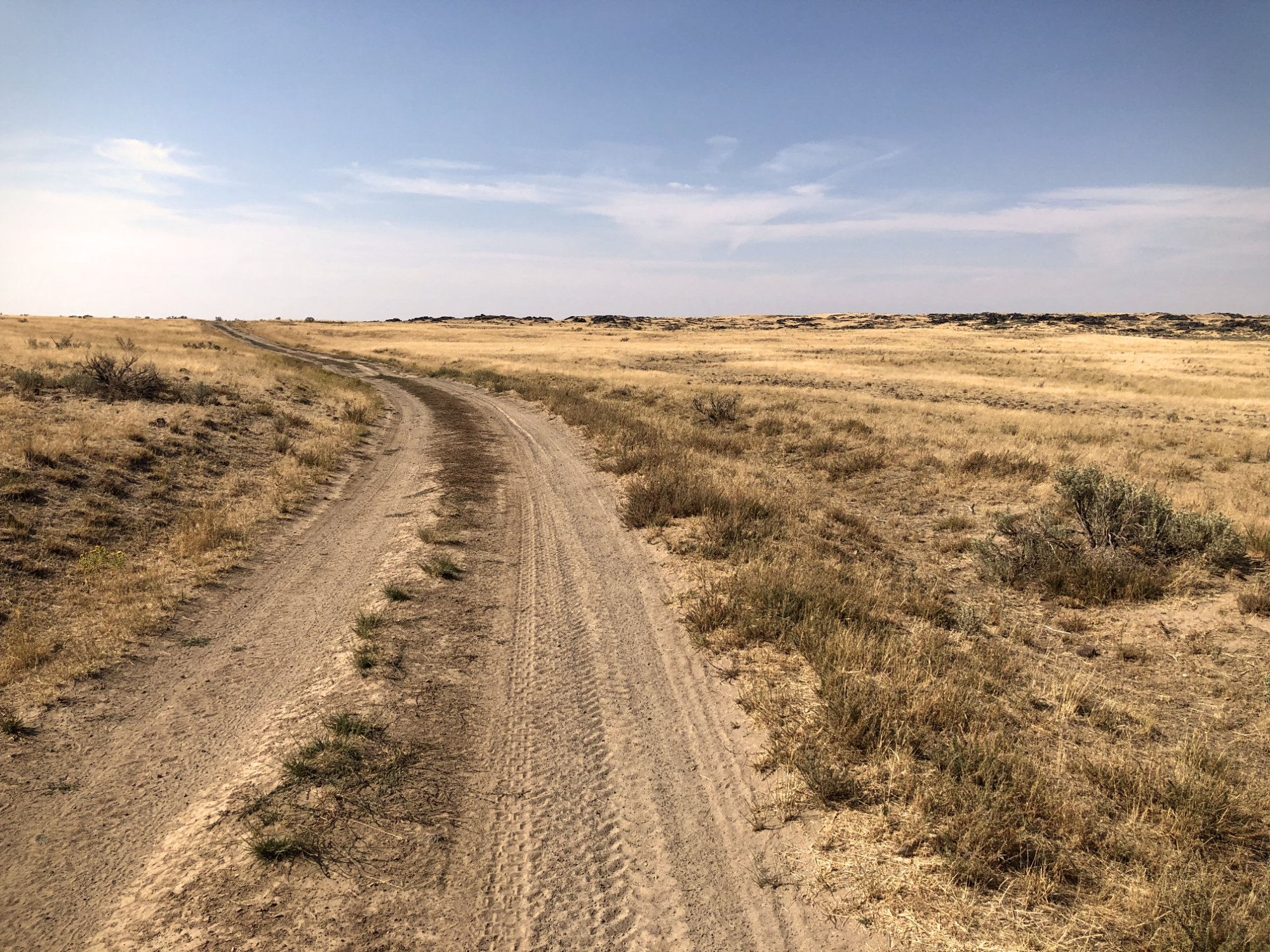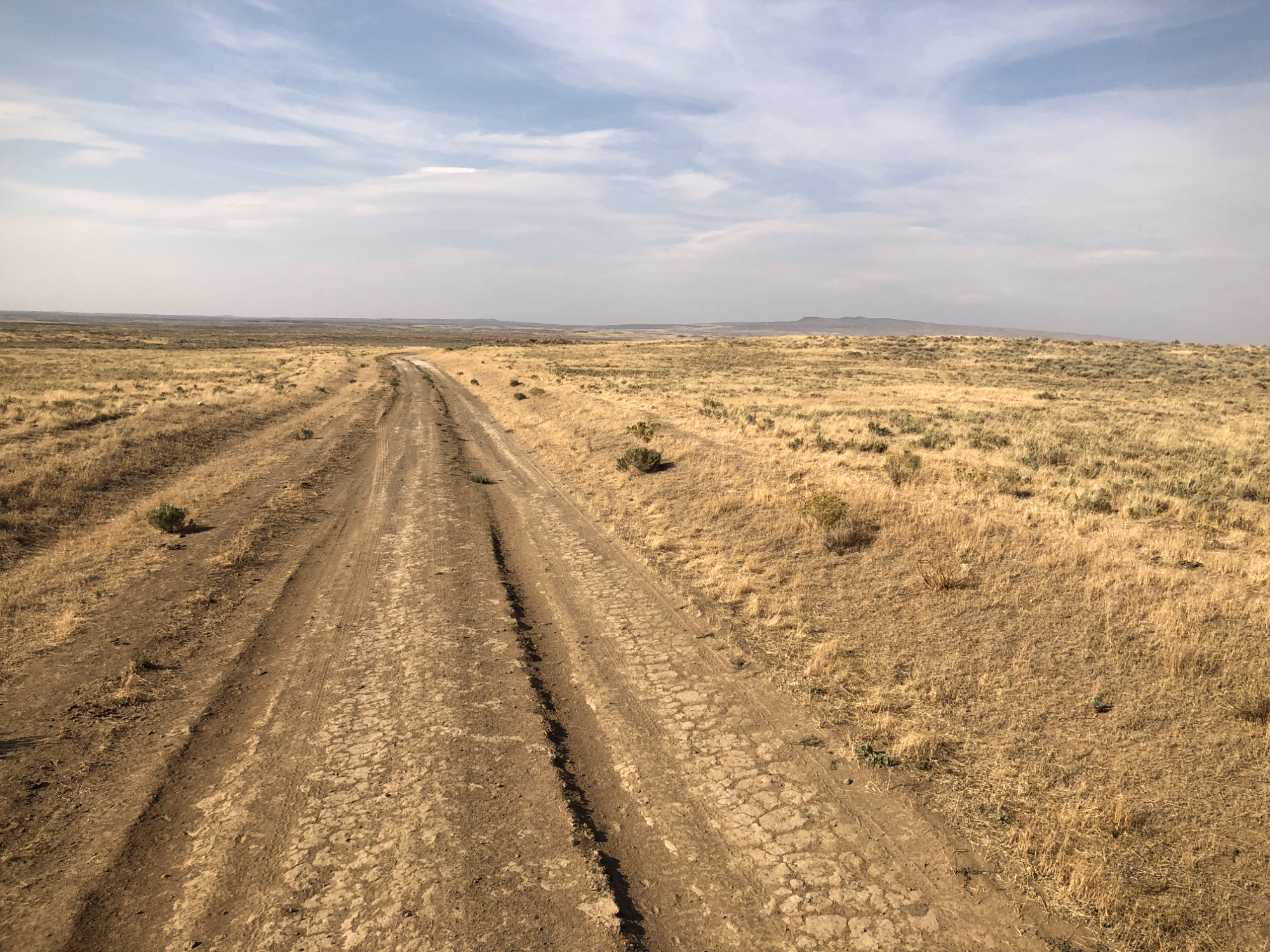 After lunch in American Falls, the route follows a rough dirt road into Craters of the Moon National Monument and Preserve for some excellent riding. The road starts out with lots of deep ruts but soon smooths out and becomes super fun, twisty two track. Small rifts appeared at the roadside and weird hills poked up far off on the horizon. A sign indicated that this section passes over the Great Rift of Idaho, though I couldn't see much of anything where it did. Roads for numerous mines and, more rarely, wells wound and disappeared into the endless grassland. The air was still very hazy, and Big Southern Butte was barely visible to the north. It was a good 60 or so miles without seeing much of anything, but I enjoyed it greatly, and found it to be one of my favorite sections of the TAT.