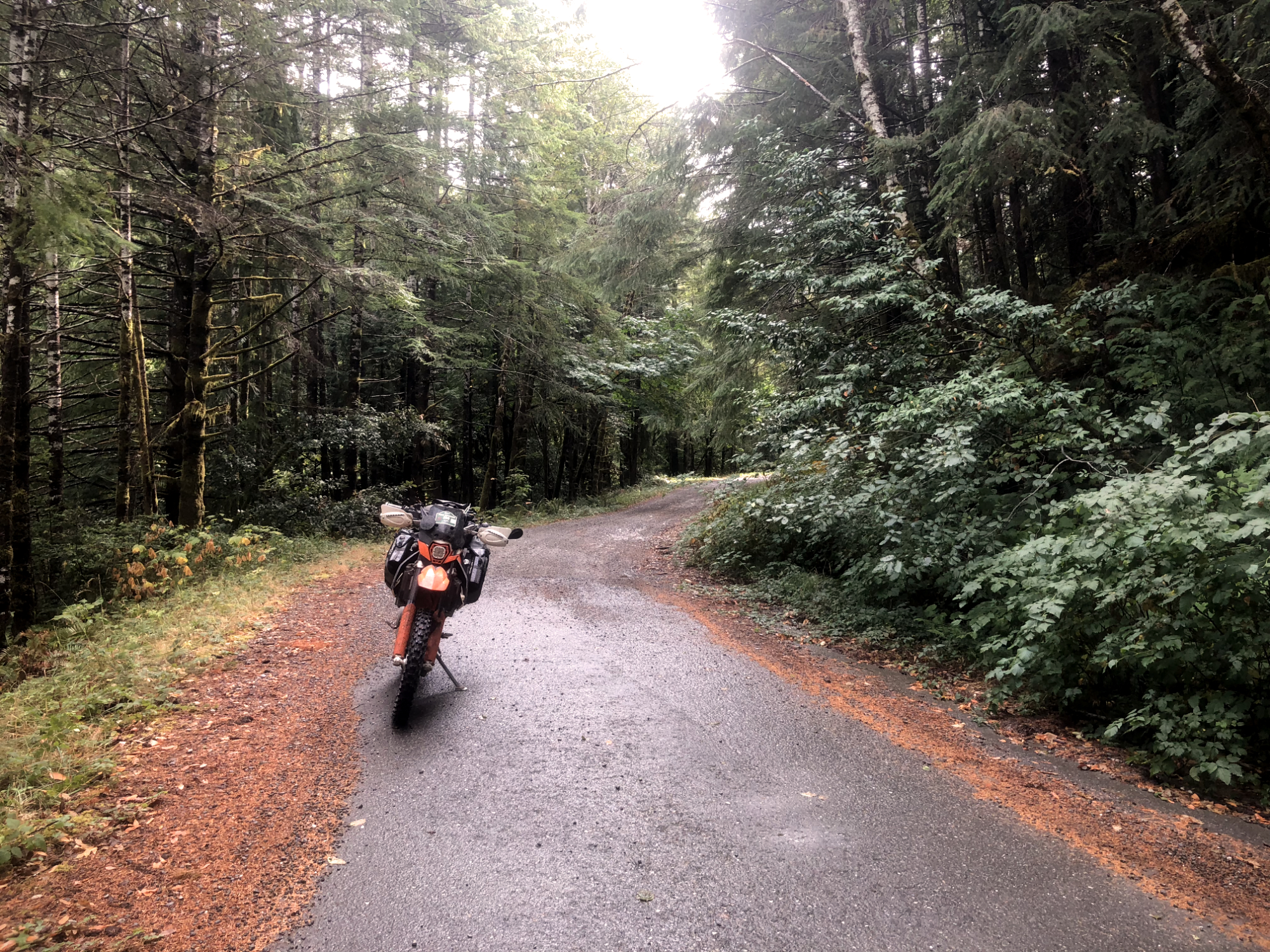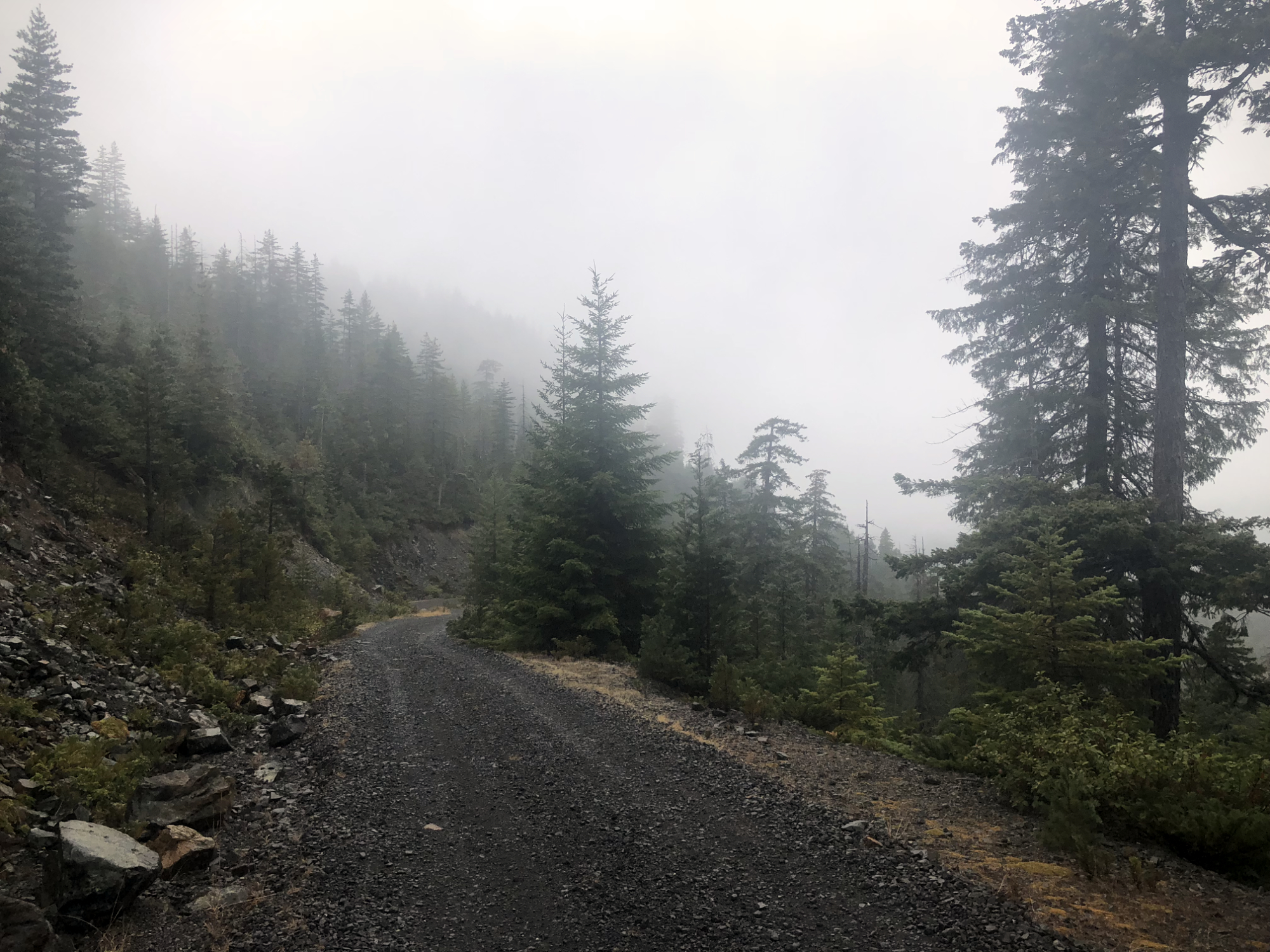 The fog thickened and rain got heavier in Siskiyou National Forest. The roads were pretty good with some rocks, but visibility was very poor. I had to sit cuz it gave me a view of the road a couple feet further than standing. At one point, I quickly looked off to my left at an overlook, and when I turned back found myself at good speed in a deep rut with a large rock ahead of me. It was a sketchy moment, but I dodged the rock and made my way out of the rut.