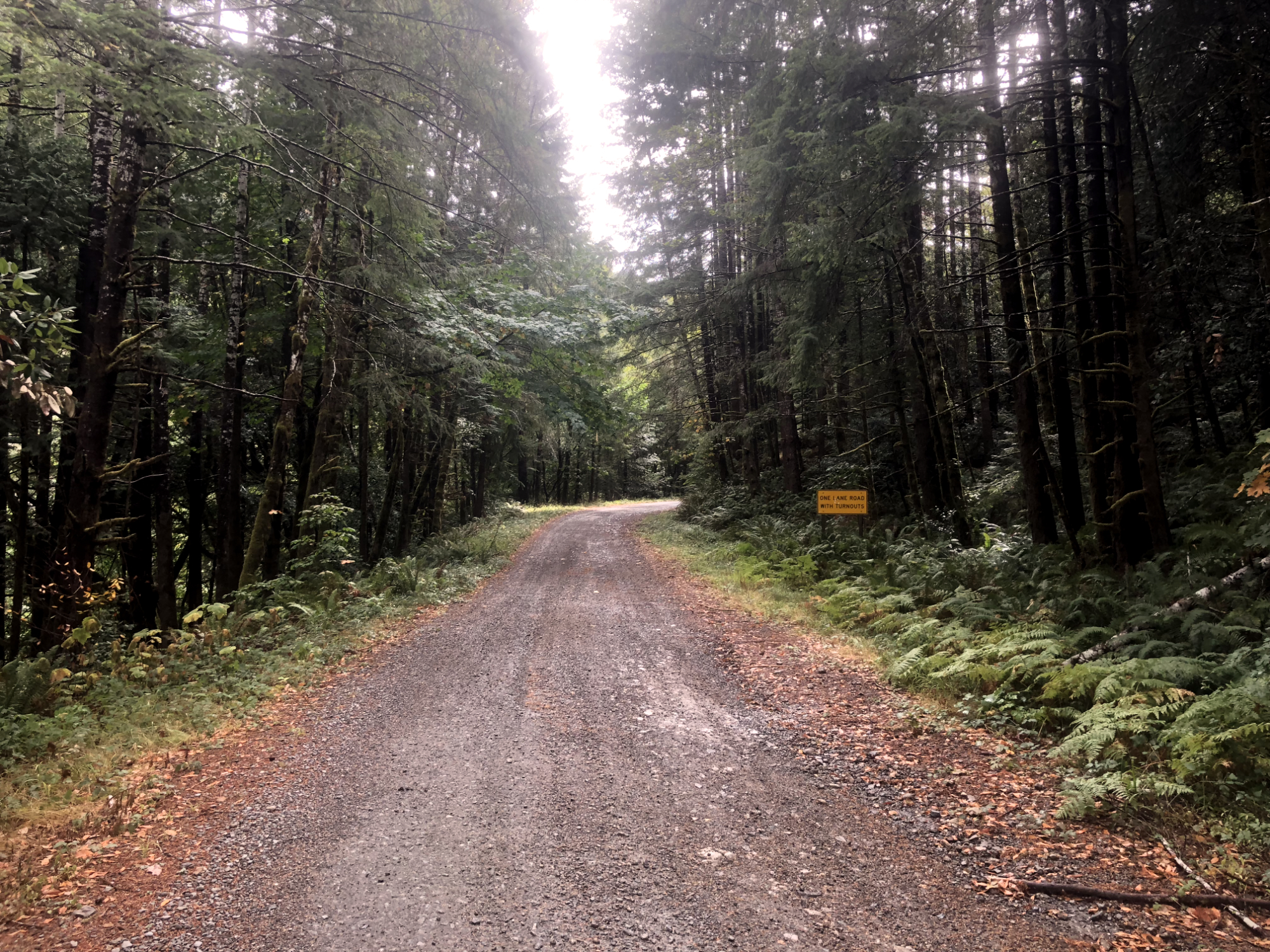 Around noon, I came over a summit to much taller pines and loads of ground foliage. It was damp everywhere with some fungal growth covering sections of the road. The air was heavy with damp air and pine scent. I was getting close to the coast. A small sign told me that much.